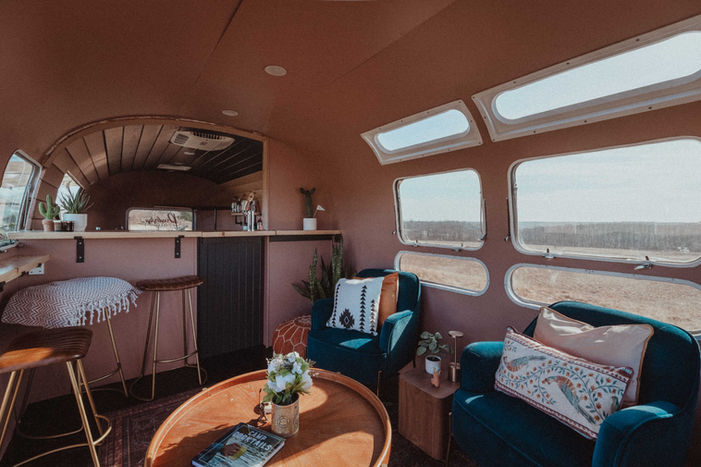 Our mobile bar includes a cozy lounge and a small, charming interior bar. The lounge accommodates